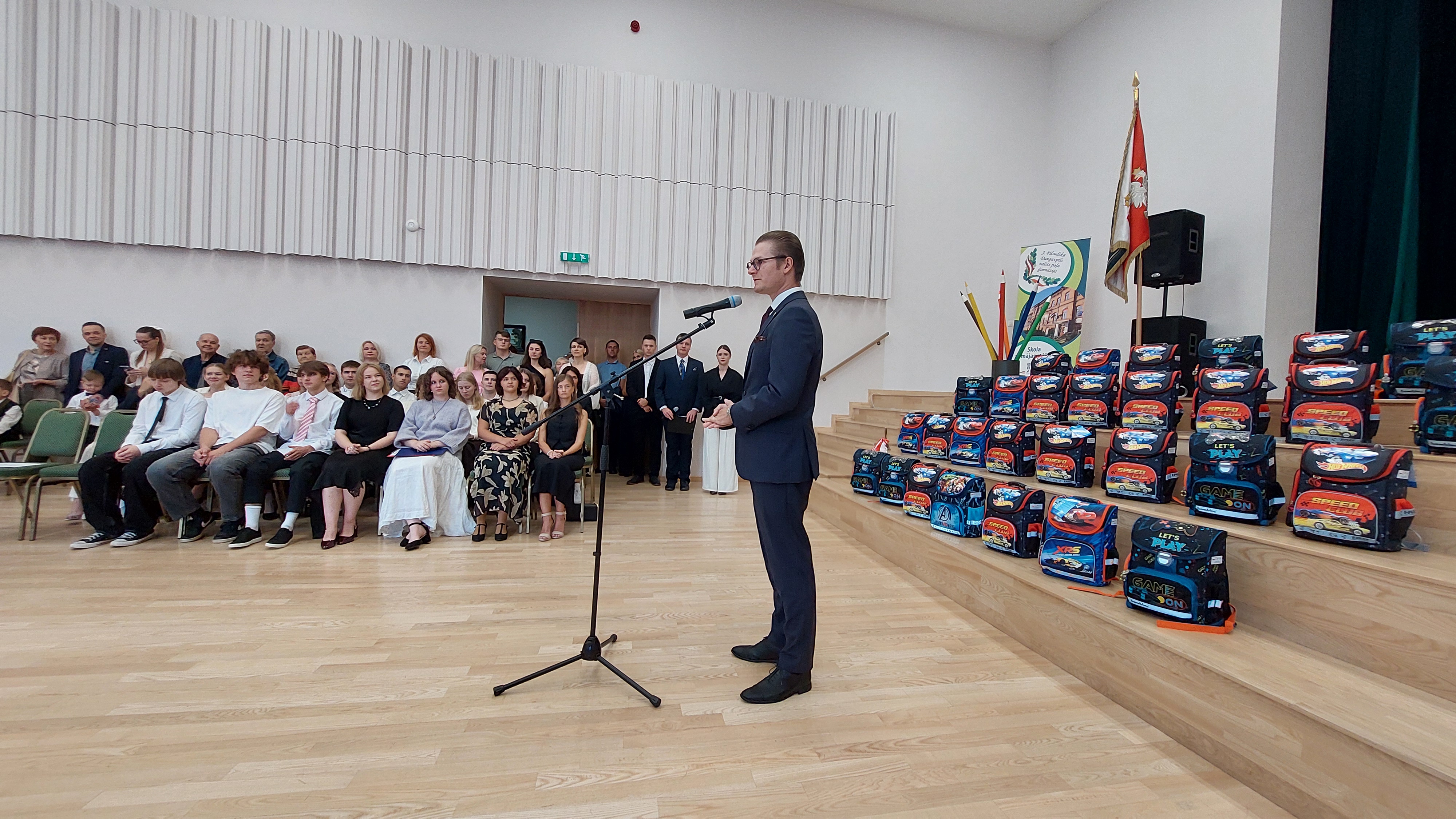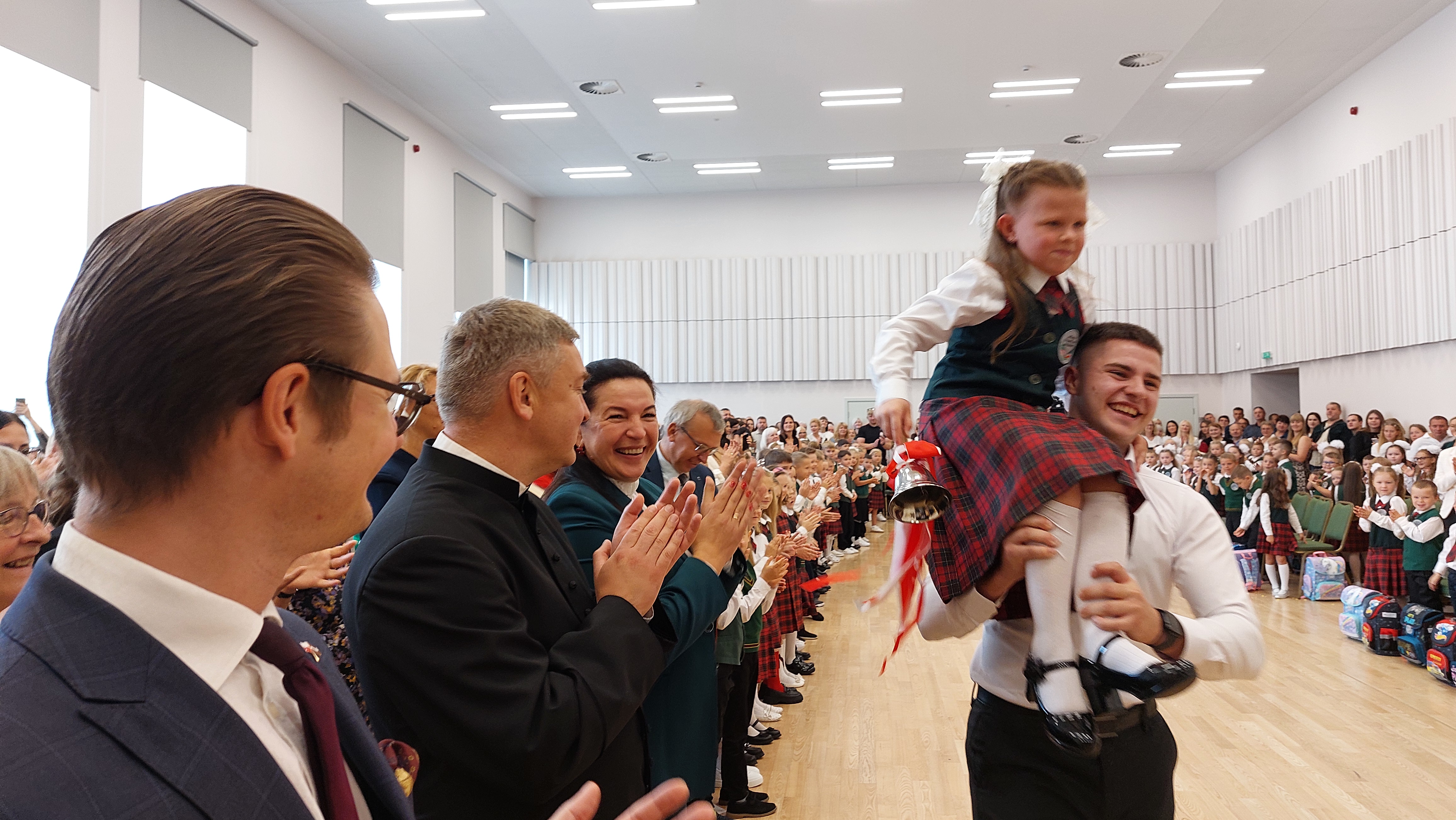 Podczas apelu szkolnego uczniom klas pierwszych Polskiego Gimnazjum wręczono wyprawki szkolne. „Bon Pierwszaka w bieżącym roku otrzymało 160 dzieci na Łotwie. Jest to inicjatywa, która w przyszłym roku będzie obchodziła dziesięciolecie. Jest to bardzo ważna inicjatywa, która w sposób wyraźny i fizyczny wspiera polskie dzieci, polskich uczniów, polskich szkół na Łotwie. Dzieci w ramach Bonu Pierwszaka, Bonu Kolbego otrzymały tornistry, pełne przyborów szkolnych, które będą im w sposób wyraźny pomagać dalej uczyć się w szkole” – mówi Mariusz Pogdórski, Konsul RP. Zadanie „Bon Kolbego dla pierwszaków i przedszkolaków na Łotwie 2025” jest realizowany przez Fundację „Pomoc Polakom na Wschodzie” im. Jana Olszewskiego.